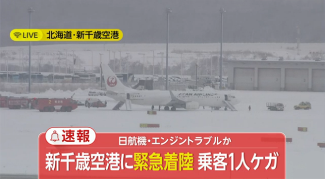 事故は23日午後3時ごろに発生。雪のため離陸を見合わせて誘導路にいた日航3512便ボーイング737-800型の右エンジンから発煙し、乗客乗員計165人が緊急脱出。この際に乗客3人が体を打つなど軽傷を負った。