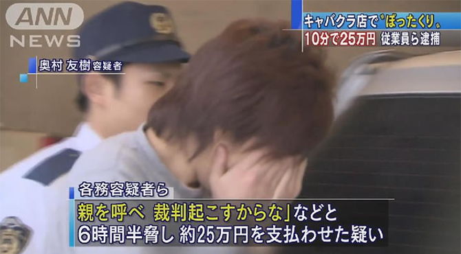 警視庁に東京都ぼったくり防止条例違反容疑で逮捕されたのは新宿区歌舞伎町にあるキャバクラ CLUB chou chou の従業員の各務利浩( 22 )・山下雅史( 24 )・奥村友樹( 23 )の 3 容疑者で、各務容疑者らは先月 15 日の深夜、10 分しか店に滞在していなかった客の男子大学生 3 人に「 払わないとどこまでも追い掛けるぞ。親を呼べ。裁判起こすからな 」などと 6 時間半にわたって脅し続け、約 25 万円を脅し取ったとされる。