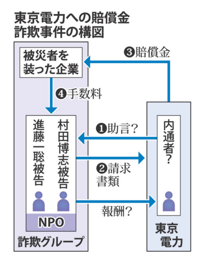 東京電力福島第1原発事故の影響で売り上げが減ったと偽り、東電から賠償金を詐取したとしてNPO法人元幹部が警視庁に逮捕された事件で、詐欺罪で起訴された元幹部が1月、「東電社員に指導を受けた見返りに報酬を支払った」と東京地裁での自身の公判で証言した。東電社員が「内通者」としてNPO側の不正に協力し、賠償金の請求方法を指南するなどした可能性があり、同庁は慎重に裏付け捜査を進めている。
