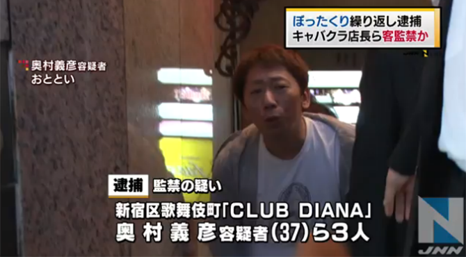 今年2月、東京・歌舞伎町のキャバクラ店「CLUB DIANA」の従業員・秋本政之容疑者(37)ら男3人が、「1時間3,000円」として客引きした男性客に約24万円を請求したうえで、店に監禁したとして警視庁に逮捕された。