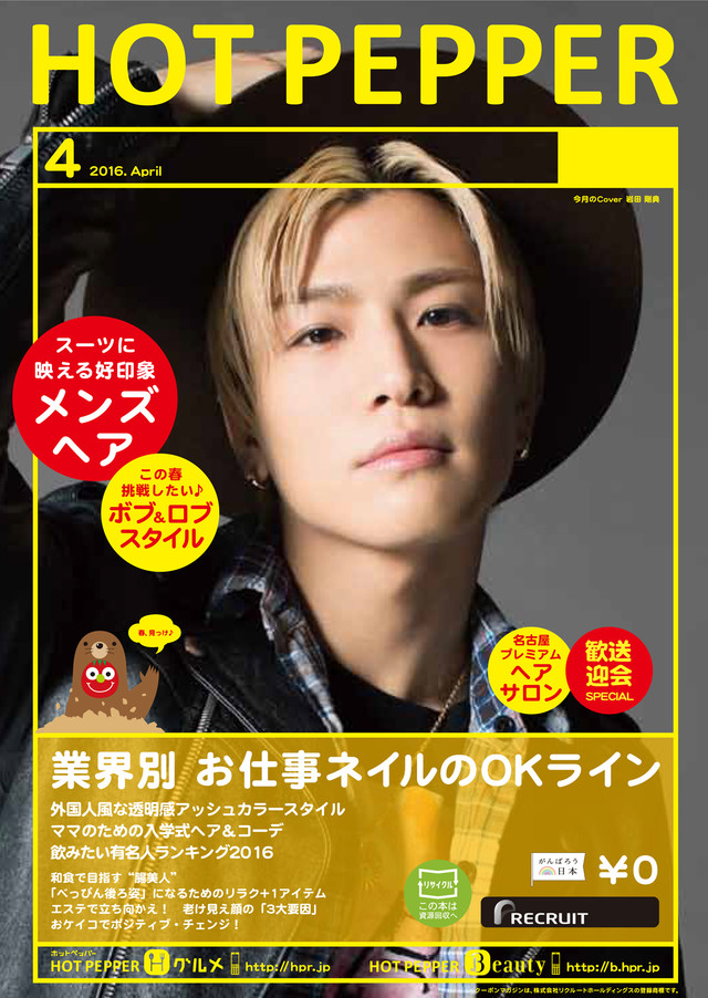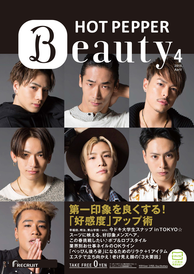 24日(木)より順次配布が開始された「HOT PEPPER」と「HOT PEPPER Beauty」4月号の表紙には、「三代目 J Soul Brothers」のメンバーが登場した。グループショットだけでなく、メンバーのソロショットも撮影し、全部で8パターンの表紙が用意された。8種類のうちどの表紙が並ぶかは、発行されるエリアによって異なり、「当日のお楽しみ」となっていた。ただ全国に1か所だけ全種類の表紙が揃う場所として、「京急線羽田空港国内線ターミナル」が告知されていた。