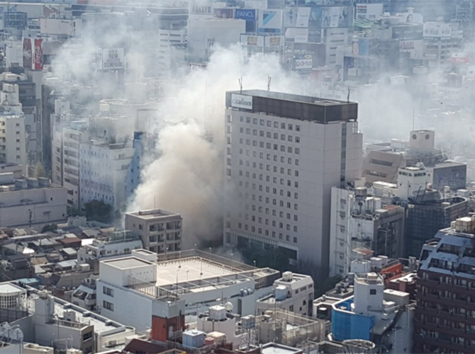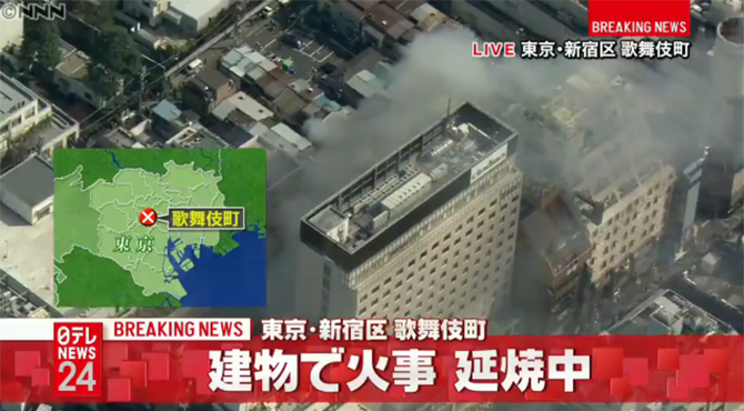 東京・歌舞伎町の建物で火事があり、12日午後1時50分現在も黒煙が立ちのぼるなど延焼中。