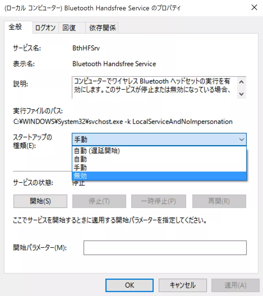 Bluetooth Handsfree Serviceをダブルクリックする下記のような画面が開くので無効に設定してOKで画面を閉じます。