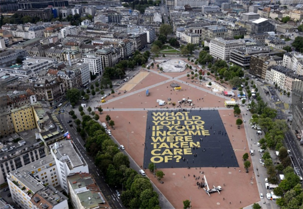 ジュネーブ中心部のプランパレ(Plainpalais)広場でこのポスターを公開した団体「ベーシック・インカム・スイス(Basic Income Switzerland)」は、財政が豊かな同国の全成人を対象に、毎月の最低所得を2500スイス・フラン(約28万円)にするよう求めている。