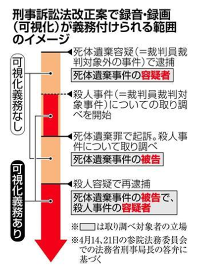 裁判員裁判の対象事件や検察の独自捜査事件で逮捕後の取り調べの全過程で録音・録画が義務づけられる。ただ、対象は逮捕・勾留事件の約3%にとどまる。