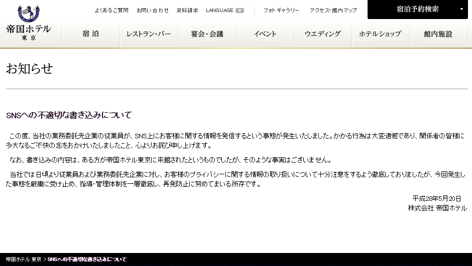 帝国ホテルは5月20日、ある芸能人が来館したという情報を業務委託先の従業員がTwitterに投稿していたことが分かったとして、不適切だったと謝罪した。