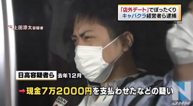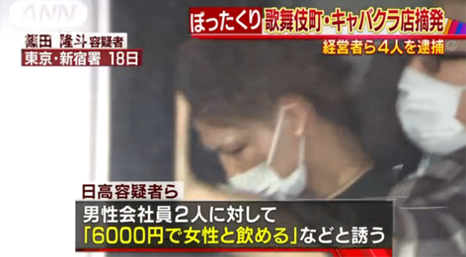 東京・歌舞伎町のキャバクラ店経営・日高和政容疑者(34)、篠田隆斗容疑者、上田涼太容疑者ら4人は去年12月、男性会社員2人対して「6,000円で女性と飲める」などと誘い、入店させると「この店は女の子を連れ出す店で別に3万円いる」などと請求し、約7万円を不当に取り立てた疑いなどが持たれています。