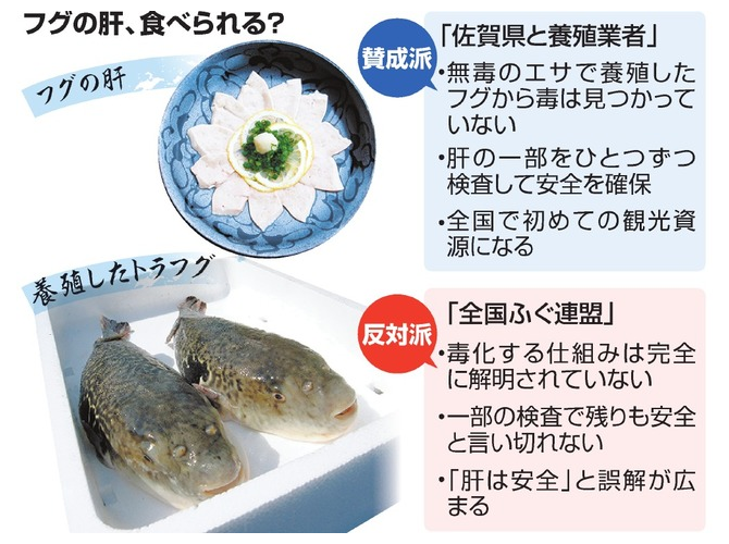 ことの発端は2月。佐賀県の山口祥義知事が、「毒のないトラフグの肝臓を提供できる」とする水産業者「萬坊(まんぼう)」(同県唐津市)の依頼を受け、養殖トラフグの肝の食用を限定的に認めるよう厚労省に申請した。全国初の観光資源にもなりうる食用フグ肝。山口知事は「(県の)第三者委員会でしっかり議論して頂いた」と、解禁に自信を見せる。