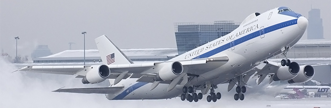 その飛行機とは、アメリカ空軍のボーイングE-4B「NAOC(国家空中指揮機)」です。E-4Bの原型は、大統領専用機VC-25と同じボーイング747-200「クラシックジャンボ」であり、塗装もよく似ています。大統領の外遊時には必ず「エアフォース・ワン」に同行し、今回のオバマ大統領来日においても、5月22日(日)には在日米空軍の嘉手納基地(沖縄県)に飛来していました。