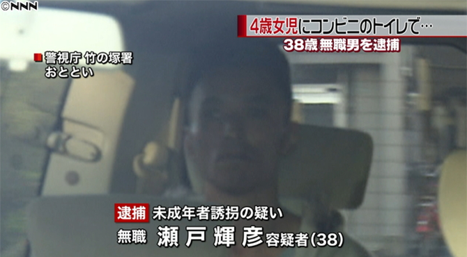 未成年者誘拐の疑いで逮捕されたのは、足立区に住む無職・瀬戸輝彦容疑者。警視庁によると、瀬戸容疑者は先月14日、公園で姉と遊んでいた4歳の女の子に声をかけ、近くのコンビニに連れ去った疑いが持たれている。瀬戸容疑者はコンビニでおむつを買い、女の子を店内のトイレに連れ込んでおむつを替えたという。
