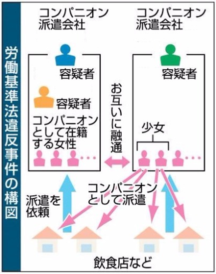 18歳未満の少女2人をコンパニオンとして宴会に派遣したとして、浜松中央署と静岡県警少年課に労働基準法違反(危険有害業務の就業制限)の疑いで逮捕された元コンパニオン派遣業の男らが、2時間1万6千円の基本料金で少女を派遣し、少女は半額を報酬として受け取っていたことが14日、捜査関係者への取材で分かった。派遣時間は延長されることが多く、静岡県警は、少女の報酬は1回につき1万円を超えていたとみて、詳しい就業状況を調べている。