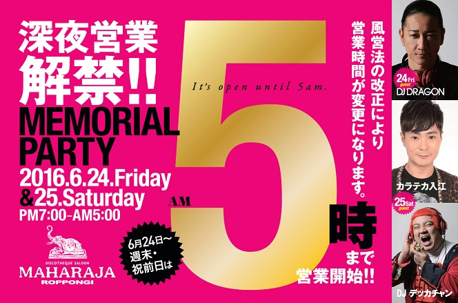 クラブの聖地、六本木界隈で30年以上の歴史を持つ『マハラジャ』(運営元:日本都市プロダクション株式会社)は、この風営法改正に伴い6月24日からAM5:00まで営業を開始いたします。