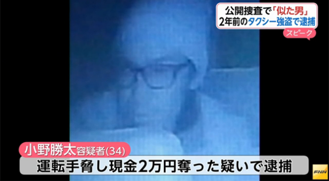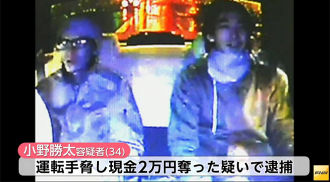 2014年2月、新宿区内で起きたタクシー強盗で、警視庁が、車載カメラの映像を公開し、捜査していたが、14日、サングラスをかけた小野勝太容疑者(34)を、運転手を刺すぞと脅し、現金2万円を奪った強盗の疑いで逮捕した。