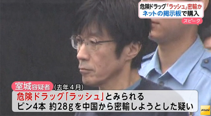 会社員の室城芳孝容疑者(56)は、2015年4月、指定薬物を含む危険ドラッグ「ラッシュ」とみられる瓶4本、およそ28グラムを、中国から密輸しようとした疑いが持たれている。
