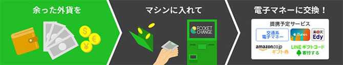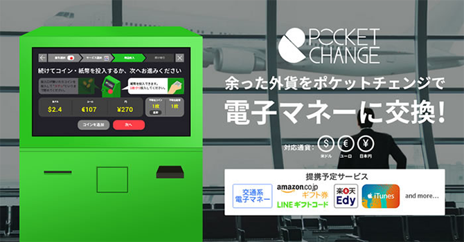海外旅行の際に余った外国硬貨や紙幣を、SuicaやPASMO、AmazonやLINEのギフトコードなどの電子マネーや各種ギフトコード、クーポンなどに両替できるサービスが羽田空港などに登場する。