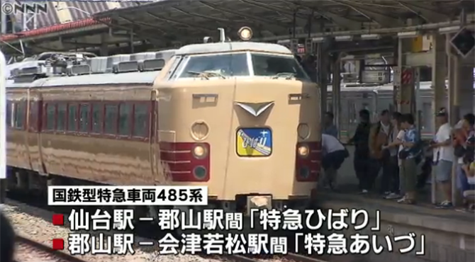 福島県内の磐越西線などを最終運行したのはクリーム色に赤のラインが入った国鉄型特急車両「485系」。1960年代から仙台・郡山間では「特急ひばり」、郡山・会津若松間では「特急あいづ」として運行され、JR東日本に国内で唯一残っていた車両だが老朽化に伴い、今回の運行を最後に引退することになった。
