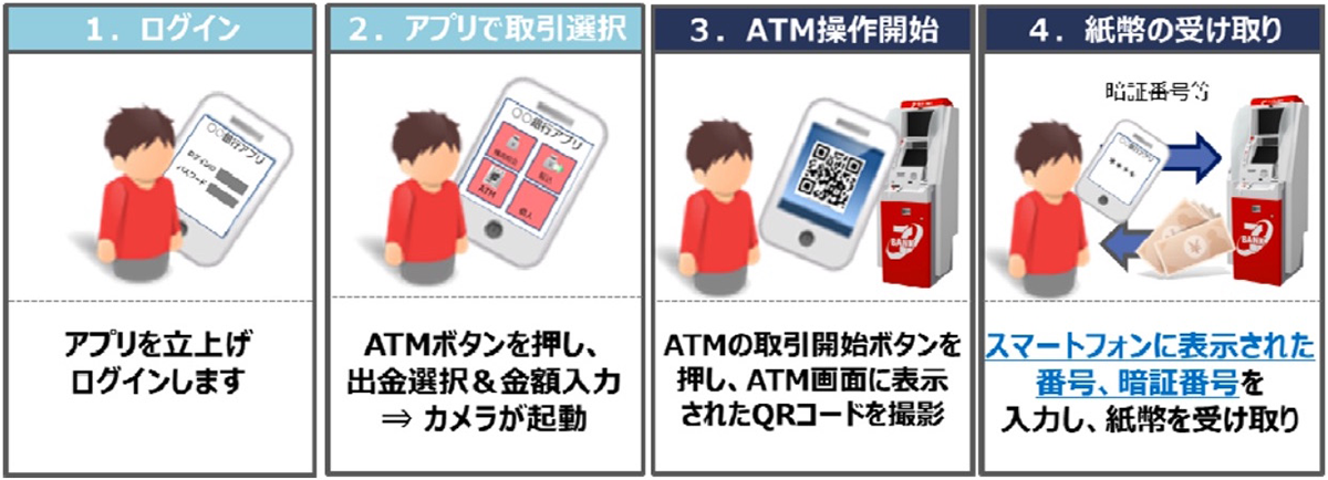ATMから出金する場合の操作は、(1)銀行取引アプリを起動し、「ATMボタン」をタップ、(2)出金する金額を選ぶと、カメラが起動、(3)ATMの「取引開始」ボタンを押し、ATM画面に表示されたQRコードをカメラで撮影、(4)スマートフォンに番号と暗証番号が表示、(5)番号と暗証番号をATMに入力する、(5)ATMから出金された紙幣を受け取る――という流れだ。