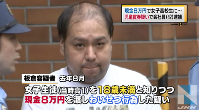 逮捕されたのは会社員の板倉賢一容疑者(42)で、去年8月、横浜市のホテルで、当時高校1年生の女子生徒(15)に対し、18歳未満と知りながら現金8万円を渡してわいせつな行為をした疑いが持たれています。