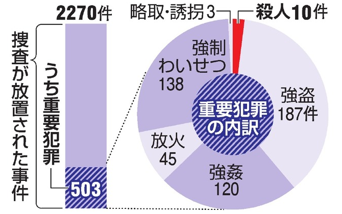 大阪府警は30日、事件捜査が長期間放置されていた問題の最終調査結果をまとめた。全65署中61署で、1975~2012年に起きた計2270事件の捜査と証拠品計8345点が放置されたまま、時効が成立していた。殺人も10件含まれ、強盗や強姦(ごうかん)などを加えた重要犯罪の放置は503事件に上る。異動時に引き継がず、証拠品も置き去りにされたとみられる。
