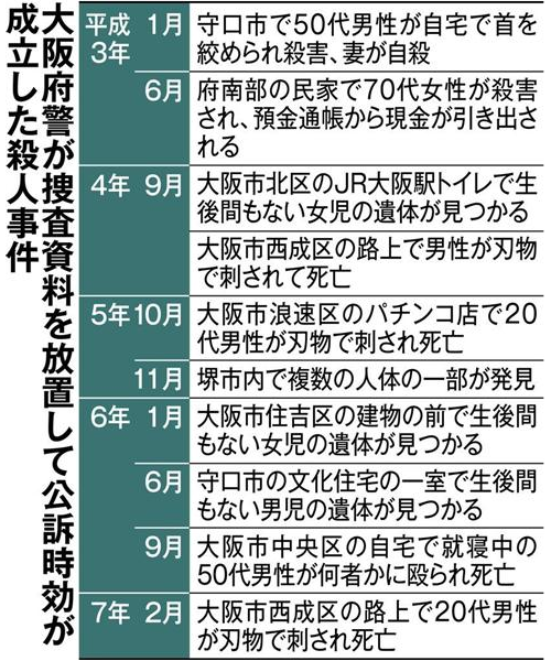 時効となった殺人事件は、生後間もない乳児の遺体が遺棄されるなど被害者の身元特定が困難なケースが多かったが、平成3年に大阪府南部で発生し、捜査本部が設置された強盗殺人事件も1件含まれていた。殺人未遂事件も20件あった。発生後、それぞれ数カ月~2年程度は捜査を続けた形跡があったものの、容疑者の特定が難航するなどして捜査態勢を縮小した後、適切な引き継ぎを行わなかったのが原因とみられる。