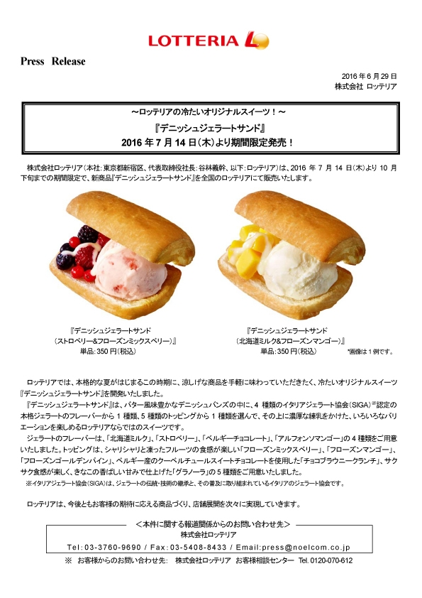 デニッシュではさむ期間限定ジェラート ロッテリア 2016年07月10日(日) 配信 フード ロッテリアは14日、冷たいスイーツ「デニッシュジェラートサンド」を売り出す。10月下旬までの期間限定。「ストロベリー」など4種類のジェラートと、「フローズンミックスベリー」など5種類のトッピングからそれぞれ1種類ずつ選び、バター風味のデニッシュ生地ではさんでいる。税込み350円。 More from my siteカービィカフェ・期間限定でオープン!心もカラダも全回復ギャグ滑らせて生ビール級に“冷え冷え” 黒ラベルビアガーデンタクシー「初乗り410円」 きょうから実証実験TOKIO山口達也 異例の離婚会見で「自分が未熟だった」と3年前から離婚話さらに思い切った対応する用意、日本経済は正念場=黒田日銀総裁グリコのアイス、東南アジアへ タイでは若者に大人気 共有:Y’s CafeTweet ジェラート , デニッシュ , ロッテリア , 期間限定 【関連記事】 カービィカフェ・期間限定でオープン!心もカラダも全回復 ギャグ滑らせて生ビール級に“冷え冷え” 黒ラベルビアガーデン 丸亀製麺のうどんで18人が食中毒の症状 こーら、すごいわ! 母が作ったコカ・コーラ型誕生日ケーキに絶賛の声 スピードワゴンが「甘強酒造 黒みりん 20年熟成」を求めて愛知・蟹江町へ 【最終更新日】 2016年7月10日(日) 2016 最新水着コレクション 新春開運キャンペーン!アンケートで一眼レフカメラ・旅行券1万円等プレゼント! http://s360.jp/ 新規口座開設で最大20,000円キャッシュバック!【外為ジャパン】 http://www.gaitamejapan.com/ オススメ!!レンタルサーバー【WADAXレンタルサーバー】 http://www.wadax.ne.jp/ 生活のすべてはセブンネットで【セブンネットショッピング】 http://7net.omni7.jp/top 高級印材を使い、高品質手彫り仕上げ印鑑実印専門店 オリジナル印鑑実印 http://www.inkans.com/