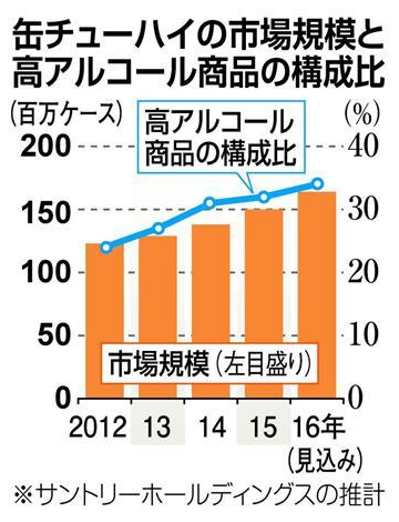 高アルコール度数の商品が缶チューハイ市場全体に占める比率は、2016年は34%と前年比で2ポイント上昇する見込み。5年前に比べると13ポイントも上昇する。ビール類の市場縮小が続くなか、メーカー各社は缶チューハイ市場を掘り起こし、収益の改善につなげる狙いもある。