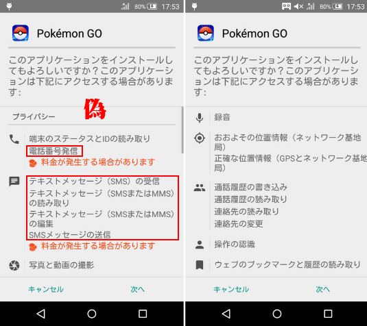 米インテルグループのマカフィー(東京都渋谷区)によると、偽アプリは米国でポケモンGOの配信が始まった翌日の7月8日に同社が発見。名称、配信元とも正規アプリと同じように表記されているが、異なるのは、利用者へアクセスする権限に、正規アプリにはないショートメッセージサービス(SMS)の配信や、通話履歴の読み取りの許可を求めている点だという。