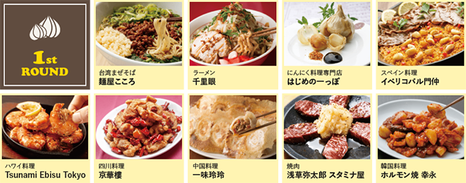 前半5日間の「1st ROUND」は、台湾まぜそば「麺屋こころ」、ラーメン「千里眼」、創作にんにく料理「はじめの一っぽ」、ハワイ料理「Tsunami Ebisu Tokyo」、四川料理「京華樓」、焼肉「浅草弥太郎 スタミナ屋」ほか9店舗が出店。