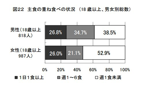 調査では、男性約6割、女性約半数が主食の重ね食べをしていて、さらに1日1食以上とる人が男女ともに4人に1人という結果に。ちなみに、重ね食べの例としては「うどん+かやくごはん」「ラーメン+チャーハン」「お好み焼き+ごはん」「パスタ+パン」が示されています。