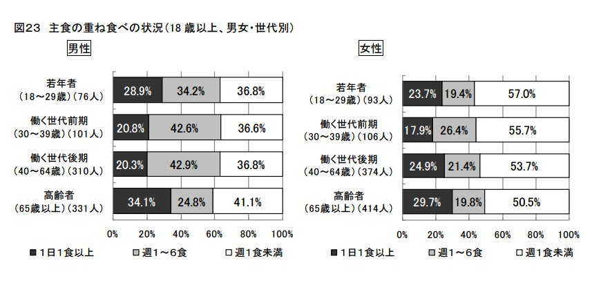 また、世代別の状況では、重ね食べを1日1食以上するのは男性65歳以上の高齢者(331人)が34.1%と一番多く、次が18歳~29歳の若年者(76人)で28.9%という結果に。女性でも同様の傾向が見られます。