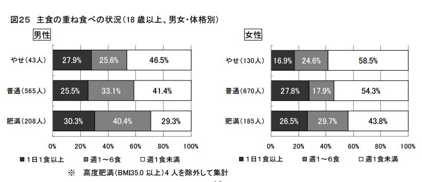 男女の体格別での摂取状況では、週に1食以上「重ね食べ」をする割合が、男性はやせ(43人)で53.5%、普通(565人)で58.6%、肥満(208人)で70.7%。女性はやせ(130人)で41.5%、普通(670人)で45.7%、肥満(185人)で56.2%と、男女とも肥満者の方が高い傾向が見られます。