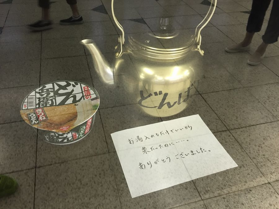 山手線渋谷駅のホームにあった、日清食品のカップ麺「どん兵衛」がその場で食べられる飲食店「どんばれ屋」。今年7月31日をもって閉店したのですが、その後店内の窓際にひっそりと残されていた書き置きが、店側の本音が漏れているとTwitterで話題になっています。