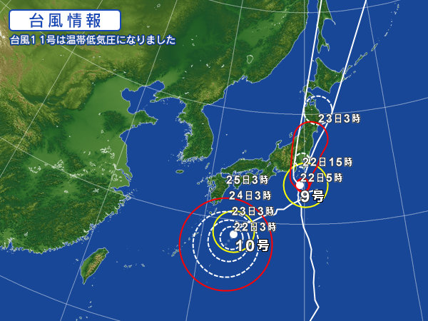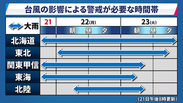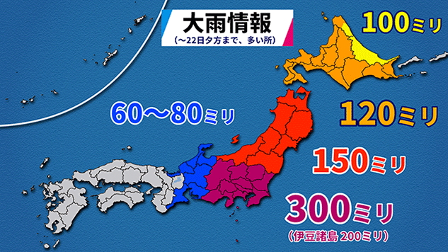 22日未明には伊豆諸島に接近し、22日昼前から昼過ぎにかけて、東日本に上陸するおそれがあるとして、警戒を呼びかけている。東日本や北日本では、雷を伴った非常に激しい雨が降り、23日午前0時までの24時間に予想される雨量は、多いところで東海地方400ミリ、関東甲信地方350ミリ、東北と北陸地方200ミリ、北海道地方120ミリとしている。