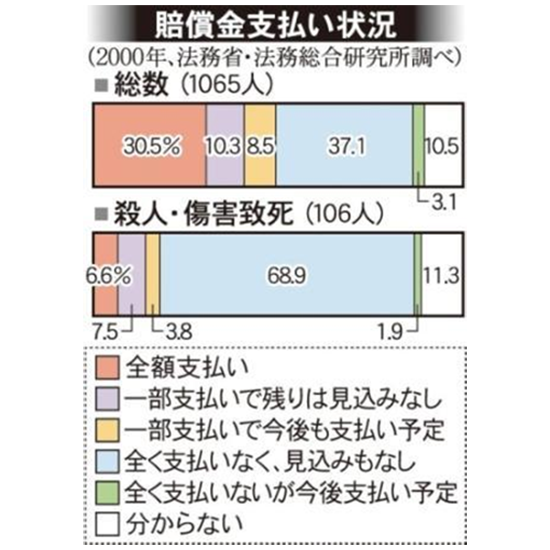 法務省のアンケートには被害者と遺族計1065人が回答。犯罪別で、不払いの割合が最も高かったのは「殺人・傷害致死」の68.9%(106人中73人)。「強盗」=47.7%(109人中52人)▽「詐欺・横領」=47.5%(122人中58人)-などが続いた。