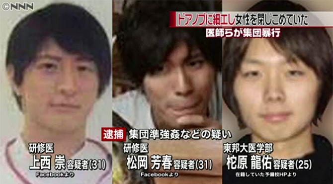 研修医ら集団準強姦で、ドアノブ細工し閉じ込め暴行