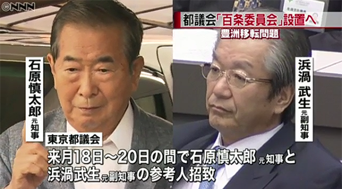 東京都議会は豊洲市場の移転問題について審議している特別委員会で、用地取得の経緯などを調べるため、来月18日から20日の間で石原慎太郎元知事と浜渦武生元副知事の参考人招致を決めている。