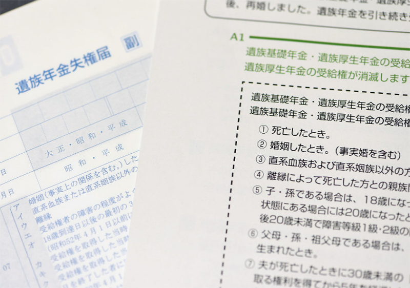 夫を亡くした妻が事実婚を含めて再婚したり、子供が18歳を超えたりするなど遺族年金の受給資格を失った場合、受給者側は年金の種類に応じて喪失日の翌日から10日または14日以内に「失権届」を最寄りの年金事務所に提出し、受給を停止させる必要がある。